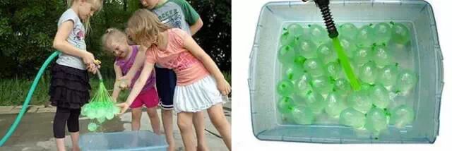 聪明的老爸发明了一个一次性将水充满数十个气球的水枪,这样孩子们打水仗可方便多了!