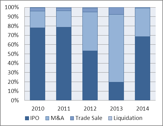 2014年IPO渠道会成为众机构最为倚重的退出方式。首先IPO之前提出的新股发行时间表——1-2两年内完成积压项目IPO依然有效,因此 IPO短期可能重新开闸,不过原先的时间表将面临更大的压力,市场也势必对期望高估值的IPO企业提出更加严苛的要求;其次,机构对回报率差异较高的敏感度,尤其在历经一年有余的IPO关停,存续基金面临的兑付压力十分严峻。